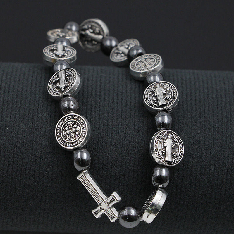 Catholic Town bracelet with Saint Benedict alloy beads 10mm wood beads and cruci